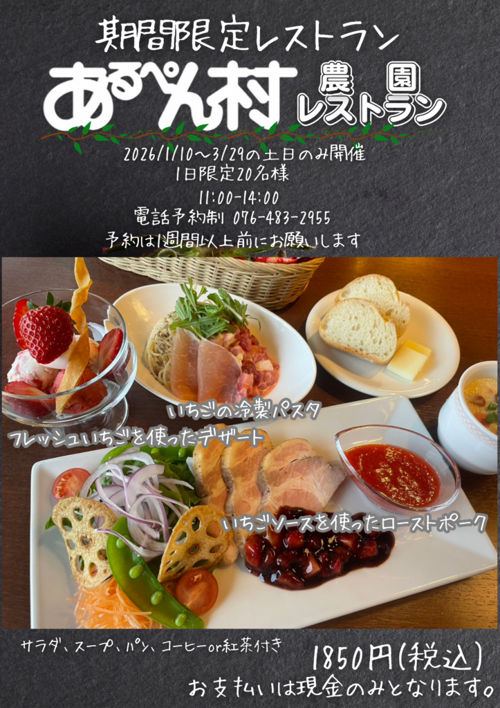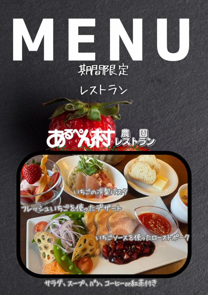 期間限定レストラン、あるぺん村農園レストランがオープンします。 あるぺん村農園レストランでは、旬のいちごを贅沢に使った期間限定メニューをお楽しみ・・・