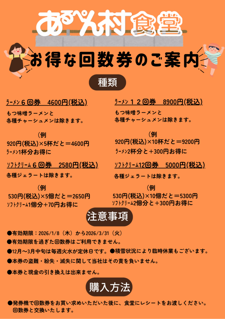 期間限定で、あるぺん村食堂で使える便利な回数券が登場しました。 お食事をもっとお得に、もっと気軽に。ご家族やご友人とのお食事にもおすすめです。ぜ・・・