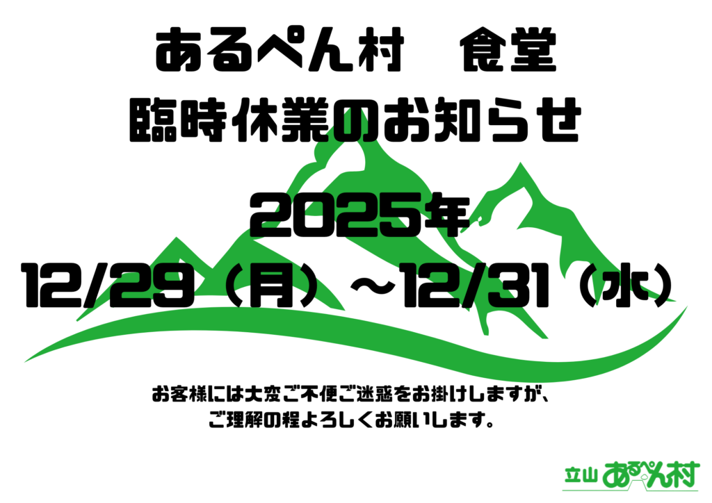 日ごろよりご愛顧いただき誠にありがとうございます。 あるぺん村食堂のみ、12/29(月)~12/31(水)まで臨時休業とさせていただきます。 お客様にはご不・・・