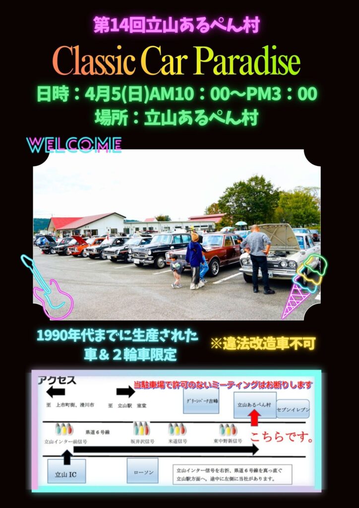 第12回クラシックカーパラダイス開催決定‼オールドカーの展示・親睦が楽しめます。2025/4/6/10:00~15:00立山あるぺん村