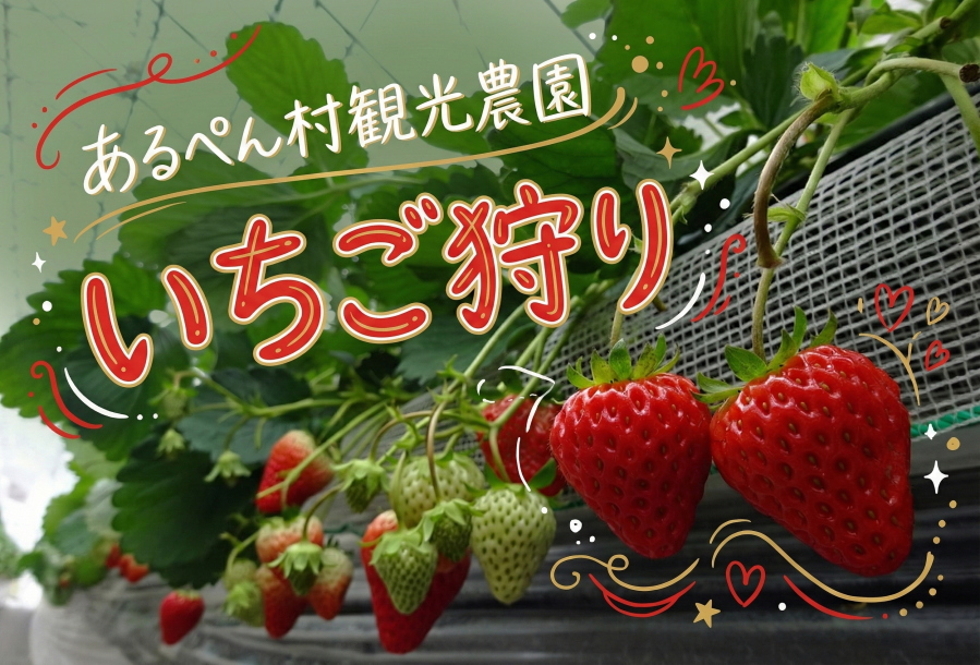 2026年いちご狩り予約開始しました! 1月末から5月末までハウスでいちご狩りをお楽しみいただけます。 ご予約はお電話かあるぺん村観光農園ホームページよ・・・